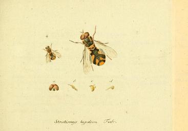 Keywords: Fauna Germanica, Diptera 1793, vol.1, p22, Stratiomys hypoleon Fabr..jpg http //biodiversitylibrary org/page/12721156 page 22 cf male of Oxycera rara Scopoli 1763 labelled as Stratiomys hypoleon Fabr de http //biodiversitylibrary org/page/12721158 Beschreibungsseite 24 Gefleckte Waffenfliege Gelbgestreifte Waffenfliege http //biodiversitylibrary org/page/12721159 Beschreibungsseite 25 Sehr selten an fliessenden Wassern Um Nürnberg + Natürliche Grösse Vergösserung a Der Kopf mit den Augen b Ein Fühlhorn c Das Schildchen d eine clava halterum vergrössert Jakob Sturm 2014-05-27 Biodiversity Heritage Library 1793-1805 1-502 22 dx doi org/10 5962/bhl title 12433 Nürnberg Latin German http //www biodiversityheritagelibrary org/bibliography/12433 1793 Georg Wolfgang Panzer; Jakob Sturm PD-old-100 Fauna Germanica Diptera Volume 1 Panzer Sturm Oxycera rara |