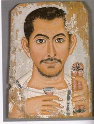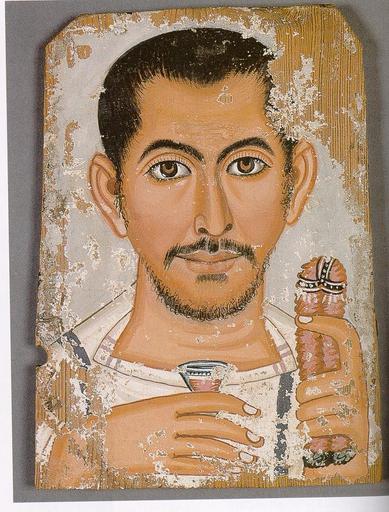 Keywords: Fayum-32.jpg encaustic portrait of man with red wine and rose-petal wreath; from Er-Rubayat fourth century CE Santa Monica Getty Museum Credits Barbara McManus 1989 Fayum mummy portrait Scanned and edited by Eloquence PD-Art Fayum mummy portraits in the Getty Villa Wine in ancient Egypt Artworks missing infobox template |