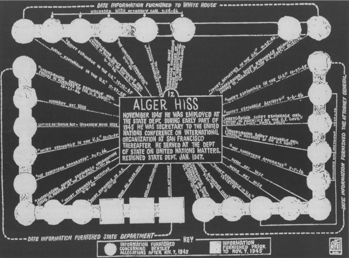 Keywords: FBI-Hiss-chart.png Chart showing dissemination to the White House State Department and Attorney General of dozens of secret FBI memos and reports on Alger Hiss beginning with the report on the Hatch Act investigation of Hiss in 1942 and running through Hiss' resignation from the State Department in January 1947 Federal Bureau of Investigation J Edgar Hoover Official and Confidential file 34 FBI Reading Room J Edgar Hoover Building 935 Pennsylvania Avenue NW Washington DC 20004 1948 U S Federal Bureau of Investigation U S Public Domain Declassified U S government document PD-USGov Federal Bureau of Investigation images Black and white photographs Alger Hiss |