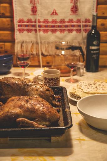 Keywords: feast meal dinner tradition traditional duck roast wine table family
