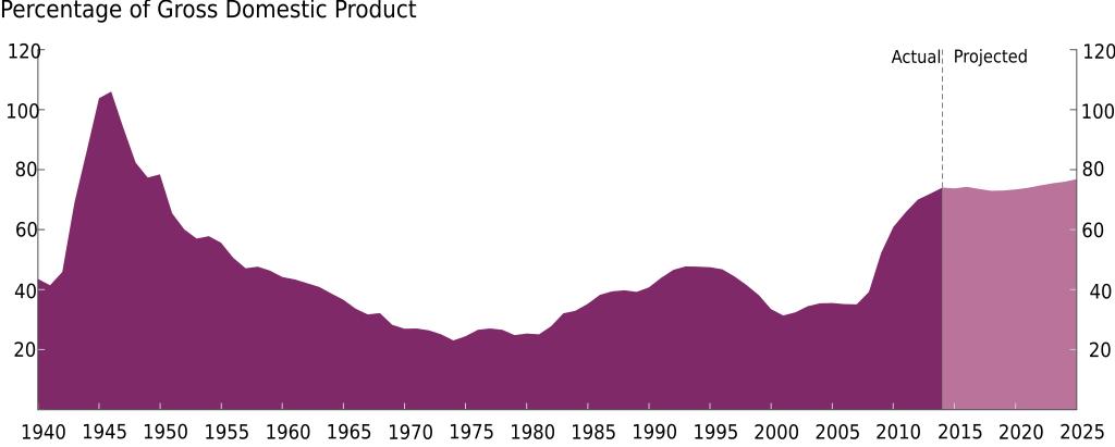 | Keywords: FederalDebt1940to2015.svg en Federal Debt Held by the Public as a percentage of gross domestic product from 1940 to 2015 projected until 2025 2015-12-16 https //www cbo gov/sites/default/files/114th-congress-2015-2016/reports/50724-Update-OneColumn_1 pdf An Update to the Budget and Economic Outlook 2015 to 2025 p 71 Congressional Budget Office PD-USGov Debt-to-GDP ratio of the United States Debt in the United States Government debt-to-GDP ratio of the United States United States in the 20th century United States in the 21st century |