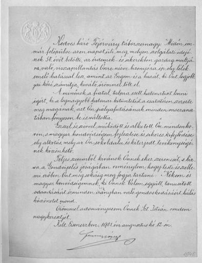 | Keywords: Fejérvary 50.jpg hu Ferenc József eredeti levele báró Fejérváry Gézához 50 éves katonai szolgálata alkalmából egyúttal értesítése a Szent István-rend nagykeresztjének adományozásáról <br /> Kedves báró Fejérváry táborszernagy Midőn im-<br /> már felépülve azon napot üli meg melyen szolgálati idejé-<br /> nek 50 évét betölti az érdemek- és sikerekben gazdag multjá-<br /> ra való visszapillantás Önre nézve bizonyára ép oly lélek-<br /> emelő hatással lesz amint az Engem és a hazát ki Önt legjobb-<br /> jai közé számitja kiváló örömmel tölt el <br /> A minőnek a fiatal talpra esett katonatiszt lenni<br /> igért ki a legnagyobb katonai kitüntetést a csatatéren szerezte<br /> meg magának azt Ön pályafutásának minden mozzana-<br /> tában fényesen be is váltotta <br /> Észszel és szívvel működött és alkotott Ön mindenko-<br /> ron s magyar hondvédségem fejlesztése és sikeres kifejlődése<br /> oly alkotás mely az Ön sokoldalu és kiterjedt tevékenységé-<br /> nek köszönhető <br /> Teljes szivemből kívánok Önnek ehez szerencsét s biz-<br /> va a Gondviselés jóságában reménylem hogy testi és szelle-<br /> mi erőben Önt még sokáig meg fogja tartani Nekem és<br /> magyar honvédségemnek ki Önnek Velem együtt tanusitott<br /> odaadásáért és minden irányban való gondoskodásáért hálás<br /> köszönetet mond <br /> Örömmel adományozom Önnek Szt István rendem<br /> nagykeresztjét <br /> Kelt Eisenerzben 1901 évi augusztus hó 12-én <br /> Ferencz József Géza Fejérváry commemorating Fejérváry's 50th anniversary of military services and also the delcaration of awarding him the big cross of the Order of Saint Stephen of Hungary 1901-08-12 Kornitzer Béla Apák és fiúk Budapest 1940 http //mek oszk hu/07400/07484/cedula html Franz Joseph I of Austria PD-old Uploaded with UploadWizard Franz Joseph I of Austria Géza Fejérváry Manuscript letters written messages Order of Saint Stephen of Hungary |