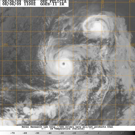 | Keywords: Felicia 06 aug 2009 1100Z.jpg en Hurricane Felicia at peak intensity Winds up to 145mph and a minimum central pressure of 937mbars In the upper right is the weakening Tropical Storm Enrique with winds of 50mph and a pressure of 1000mbar http //www nrlmry navy mil/TC html NRL 2009-08-06 PD-USGov-Military-Navy Hurricane Felicia 2009 |