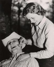 | Keywords: Female student shaves male student (University of Houston Frontier Fiesta, 1950s).jpg en A student smiles as his beard removal is almost complete http //digital lib uh edu/u /p15195coll14 62 University of Houston s 1950 This image is in the public domain and may be used freely If publishing in print electronically or on a website please use the citation Courtesy of Special Collections University of Houston Libraries To order a higher resolution reproduction see http //info lib uh edu/about/campus-libraries-collections/special-collections-archives/request-digital University of Houston Shaving |