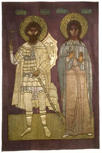 Keywords: Feodor and Irina (1592, GRM).jpg ВЕЛИКО УЧЕ ИК ФЕОДОР СТРАТИЛАТ И УЧЕ ИЦА ИРИ А 1592 год осква Камка золотые се еб яные и шелковые нити; шитье «в п ик еп» «в аскол» и по настилу 109 5 х 71 7 Поступил в 1922 году из Чесменской военной богадельни импе ато а иколая I че ез Г Ф Входила в состав иконостаса исполненного повелением ца я Федо а Иоанновича и ца ицы И ины Федо овны В XVII веке походный иконостас х анился в Об азной палате осковского К емля затем в Зимнем дво це в Пете бу ге с 1812 года в це кви Рождества Х истова в Чесменском дво це Рестав и ована в 1938 году в ГР А Суво овым изоб ажения вы езаны по конту ам ук еплены и пе еложены на новый фон фиолетовую к ашенину ГР инв ДРТ-315 http //www svyatayarus ru/data/sewing/107_fedor/index php 1592 год anonymous PD-Art Exhibition Sainte Russie Moscow 2011 - textile Theodore Stratelates and Irina Embroidery in Russian museum 16th-century Russian orthodox embroidery Irina Godunova Embroidery of Russian tsarinas and Grand Duchess Files uploaded by Shakko from various sources Feodor III of Russia's items Coats of arms of the Tsardom of Russia