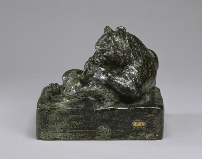 Keywords: Ferdinand Barbedienne - Bear in a Trough - Walters 27111 - Profile.jpg Walters Art Museum artwork Creator Antoine-Louis Barye A bear lies in its water trough holding food between its paws When Barye exhibited a plaster of this sculpture at the Paris Salon in 1833 he titled it Alpine Bear A cast in bronze by Honoré Gonon was subsequently purchased along with the Dead Gazelle by the duke of Orléans No other casts were made during Barye's lifetime This particular cast bearing a gold plate stamped FB was issued between 1876 and 1889 by Ferdinand Barbedienne who had purchased a plaster model for it at the artist's estate sale in 1876 modeled 1832; cast 1876-1889 bronze with a black over green patina cm 11 4 13 3 9 8 accession number 27 111 14405 William T Walters Baltimore prior to 1889 mode of acquisition unknown Henry Walters city Baltimore Walters Art Museum Henry Walters Acquired by William T Walters before 1889 Signature BARYE; Signature Cast through from model F BARBEDIENNE FONDEUR; Number Engraved on underside of cast 115; Transcription Stamped on rectangular gold plate and set into bronze FB; Number Painted inside in white W 88 The Works of Antoine-Louis Barye American Art Gallery New York New York 1889-1890 Untamed The Art of Antoine-Louis Barye The Walters Art Museum Baltimore; Philbrook Museum of Art Tulsa; The Henry Morrison Flagler Museum Palm Beach 2007-2008 place of origin Paris France Walters Art Museum license Sculptures by Antoine-Louis Barye Ferdinand Barbedienne Media contributed by the Walters Art Museum needs category review Sculptures in the Walters Art Museum |