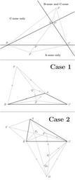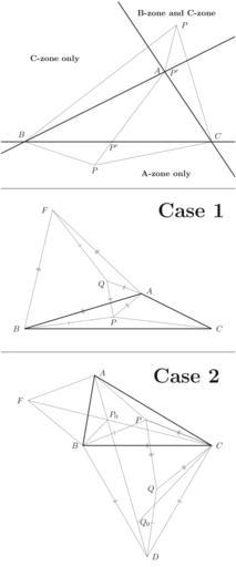 Keywords: Fermat Point Scope.svg en A purely geometric treatment of the Fermat point own MRFS 2008-08-31 fermat proof png Source The main reason for this diagram is to emphasise that the Fermat point is NOT the same as the first isogonic center which is unfortunately a very widespread misconception The source is licensed under the same license as the image Feel free to edit fix or improve it fermat_point_scope euk <pre> Combination of 3 figures in 1 box 0 0 10 24 draw segment point 0 9 point 10 9 draw segment point 0 16 point 10 16 Proof that the Fermat point lies within the triangle A point 7 21 B point 1 18 C point 9 18 D point 4 17 E point 7 5 23 thickness 2 draw line B C draw line A B draw line A C thickness 0 5 draw segment D A draw segment D B draw segment D C draw segment E A draw segment E B draw segment E C label A 0 2 170 label B 0 2 110 label C 0 2 45 draw P' intersection line A D line B C 0 1 280 draw P D 0 1 270 draw \textbf A-zone only D 2 350 draw P' A 0 2 355 draw P E 0 2 0 draw \textbf B-zone and C-zone E 0 4 90 draw \textbf C-zone only segment A B 2 120 Case 1 - an angle at least 120 degrees H point 6 11 5 I point 1 10 J point 9 10 K point 4 8 10 5 I H F equilateral K H G equilateral thickness 2 draw H I J thickness 0 5 draw H K G draw segment F H draw segment F I draw segment F G draw segment K I draw segment K J draw A H 0 2 20 draw B I 0 2 180 draw C J 0 2 0 draw P K 0 1 270 draw Q G 0 1 210 draw F F 0 2 180 draw \textbf \Huge Case 1 F 4 5 0 mark segment K I simple 0 7 mark segment G F simple 0 7 mark segment H K double 0 7 mark segment K G double 0 7 mark segment G H double 0 7 mark segment H I triple 0 7 mark segment I F triple 0 7 mark segment F H triple 0 7 Case 2 - no angle greater than 120 degrees L point 4 8 M point 3 5 5 N point 9 5 P point 6 2 6 1 M L O equilateral N P Q equilateral N M R equilateral S intersection line N O line L R N S T equilateral thickness 2 draw L M N thickness 0 5 draw N P Q draw segment M R draw segment N R draw segment O L draw segment O M draw segment R Q draw segment P L draw segment P N draw segment M P draw segment S M draw A L 0 2 20 draw B M 0 2 180 draw C N 0 2 0 draw P P 0 2 180 draw Q Q 0 1 180 draw F O 0 2 180 draw D R 0 2 0 draw P_0 S 0 1 45 draw Q_0 T 0 1 0 draw \textbf \Huge Case 2 L 2 5 0 draw segment L R draw segment N O draw segment N T mark segment M P simple 0 7 mark segment Q R simple 0 7 mark segment N P triple 0 7 mark segment N Q triple 0 7 mark segment P Q triple 0 7 mark segment M N double 0 7 mark segment M R double 0 7 mark segment N R double 0 7 </pre> Fermat point |