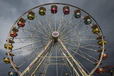 Keywords: ferris wheel thrilling fun entertainment recreation excitement joy fairground high ride outdoors attraction evening