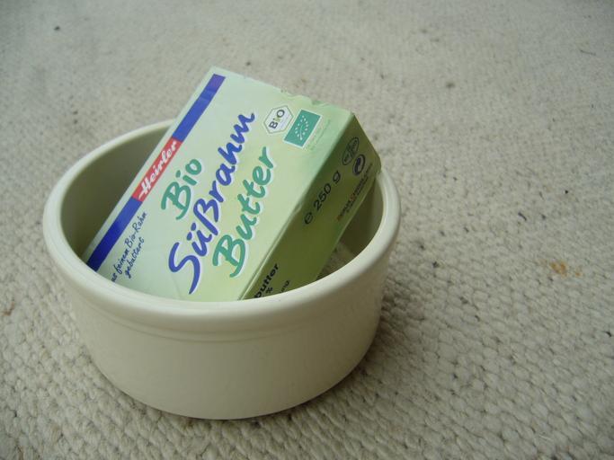 Keywords: Fettnäpfchen.JPG en Image that might illustrate the saying to put one's foot in it in German they say to have put one's foot in a small pot of fat - so here you are - before the deed ;- ins Fettnäpfchen getreten sein own C Koltzenburg 2013-06-03 Butter dishes Butter packaging Food paper cartons Sticks of butter Cc-zero |