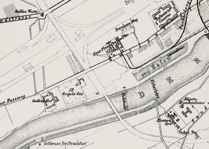 Keywords: FFM Ravenstein-Plan 1885 Gutleut Niederrad.png Nicolas Alexandre Salins de Montfort 1753 Versailles; 1838 Nantes auf seinem Gut eine prĂ€chtige Villa bauen 1944 zerstört 1883 erwirbt der Rentner L Sommerhoff den Gogelschen Landsitz; seit 1928 befindet sich dort der öffentlich zugĂ€ngliche Sommerhoffpark Entlang der GutleutstraĂe liegen die Neue Frankfurter Gas-Fabrik mit Petroleum-Magazin sowie die Infanterie Caserne; letztere steht heute auf dem GelĂ€nde des dortigen Behördenzentrums SĂŒdlich der Kaserne der am Mainufer in Entstehung befindliche Frankfurter Westhafen Im Hafenbecken eingezeichnet die Lage des vormaligen Grindbrunnens Grindbrun eine schwefelhaltige Quelle Die auf der Karte mit gestrichelten Linien eingezeichnete breite Flussquerung westlich des Nadelwehrs zeigt den Standort der heutigen EisenbahnbrĂŒcke Main-Neckar-BrĂŒcke SĂŒdlich des Mains zwei KrankenhĂ€user Allgem Krankenhaus Blattern Spit heute Standort der UniversitĂ€tskliniken in Niederrad SĂŒdlich bis westlich des KlinikgelĂ€ndes der damalige Unterlauf des Königsbachs/Luderbachs Seit dem 20 Jahrhundert verlĂ€uft der Bach kanalisiert und unterirdisch einige Meter weiter westlich und mĂŒndet am FuĂ der Main-Neckar-BrĂŒcke verdolt in den Main Auf der Landzunge der entlang des sĂŒdlichen Flussufers eingezeichneten Schleuse Bei Frankfurt befindet sich seit dem Jahr 1900 das bis in die Gegenwart bestehende Licht- und Luftbad Niederrad Eine Wehranlage der Schleusenkammer ist erhalten geblieben Das zur Schleuse gehörige im spĂ€ten 19 Jahrhundert errichtete Nadelwehr östlich der Main-Neckar-BrĂŒcke existiert seit etwa 1928 nicht mehr Scanned from Wolfgang Klötzer Wilfried Ehrlich Sachsenhausen 1885 und heute Herausgegeben von der Frankfurter Sparkasse von 1882 Polytechnische Gesellschaft Frankfurt am Main 1985 Ausschnitt des vorderen Vorsatzblattes Plan von Sachsenhausen aus RavensteinfĂŒhrer 4 Auflage 1885 1885 Ravensteinsche Verlagsanstalt Frankfurt am Main Nicolas Alexandre Salins de Montfort Frankfurt-Gutleutviertel Frankfurt-Niederrad Frankfurt-Westhafen Frankfurt am Main in the 1880s Westhafen Maps of Frankfurt am Main showing 19th-century history Westhafen PD-old-70-1923 ImageNote 1 827 760 154 193 1713 1225 2 Geplante Main-Neckar-BrĂŒcke EisenbahnbrĂŒcke ImageNoteEnd 1 ImageNote 2 467 662 251 210 1713 1225 2 Heute Sommerhoffpark historische Bebauung ist nur in wenigen Mauerfragmenten erhalten ImageNoteEnd 2 ImageNote 3 1287 842 73 86 1713 1225 2 MĂŒndung des Königsbachs/Luderbachs; im spĂ€ten 19 Jhdt durch Kanalisierung nach Westen an den FuĂ der Main-Neckar-BrĂŒcke verlegt ImageNoteEnd 3 ImageNote 4 272 1045 709 56 1713 1225 2 Heute Licht- und Luftbad Niederrad ImageNoteEnd 4 ImageNote 5 1368 822 270 231 1713 1225 2 Heute Standort des Frankfurter UniversitĂ€tsklinikums ImageNoteEnd 5 ImageNote 6 1092 493 315 126 1713 1225 2 Heute Frankfurter Westhafen ImageNoteEnd 6 ImageNote 7 1351 415 66 69 1713 1225 2 Grindbrunnen nicht erhalten ImageNoteEnd 7 ImageNote 8 2 784 210 96 1713 1225 2 Griesheimer FuĂweg; heute Fortsetzung der GutleutstraĂe ImageNoteEnd 8 ImageNote 9 317 735 143 184 1713 1225 2 Gutleuthof ehemaliges Leprosenspital ; nicht erhalten ImageNoteEnd 9 ImageNote 10 285 1156 86 64 1713 1225 2 Heute Sitz der Frankfurter Zweigstelle des Wasser- und Schifffahrtsamts Aschaffenburg ImageNoteEnd 10 ImageNote 11 989 730 75 195 1713 1225 2 Ehemaliges Nadelwehr; im spĂ€ten 19 Jhdt durch das flussabwĂ€rts liegende Walzenwehr der Staustufe Griesheim ersetzt ImageNoteEnd 11 ImageNote 12 1221 39 248 195 1713 1225 2 GröĂtenteils erhaltene Bauten heute zum Komplex des Frankfurter Finanzamtes gehörend ImageNoteEnd 12 ImageNote 13 831 199 276 278 1713 1225 2 Petroleum-Magazin und Gasfabrik; nicht erhalten ImageNoteEnd 13 ImageNote 14 1218 632 94 203 1713 1225 2 MainfĂ€hre nicht erhalten ImageNoteEnd 14 ImageNote 15 2 109 319 84 1713 1225 2 Mainzer LandstraĂe ImageNoteEnd 15 |