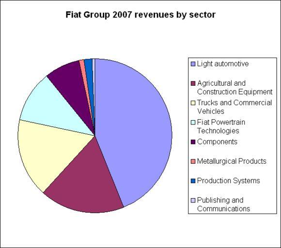 Keywords: Fiat Group revenues 2007.png en Fiat Group revenues 2007 own Typ932 2008-10-25 Light automotive 43 00 - Agricultural and construction 17 - Trucks and Commercial vehicles 17 - Fiat Powertrain Technologies 11 - Components 8 - Production systems 2 - Metallurgical products 1 - Publishing and Communications 1 Source http //www fiatgroup com/en-us/shai/banns/history/Pages/ricavi_ifrs aspx Fiat |