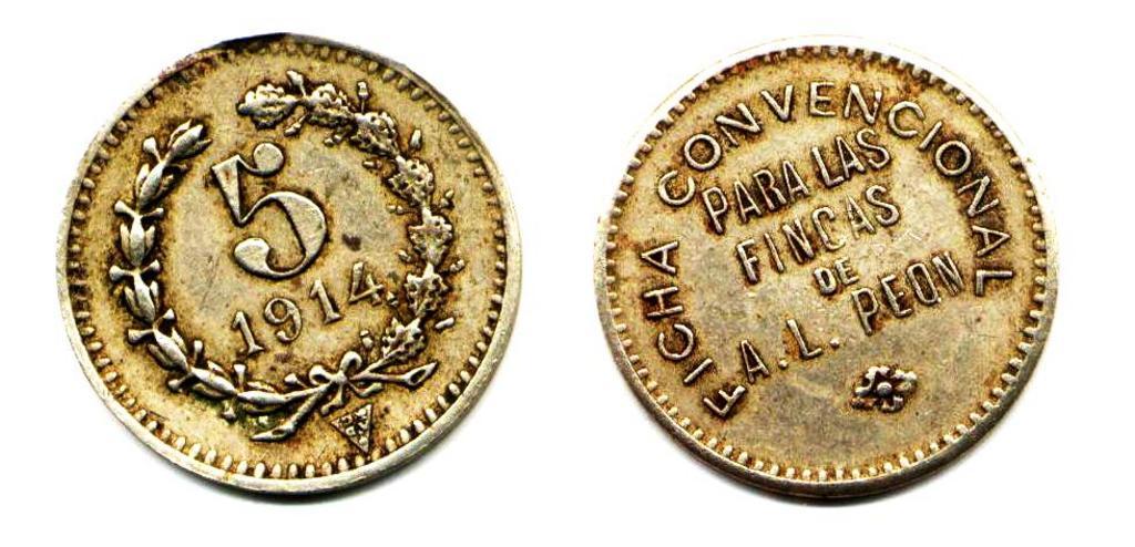 Keywords: Ficha por $ 0.05 de las fincas de Agusto L. Peón de 1914, Yucatán (01)(anverso y reverso).jpg es Ficha por 0 05 de las fincas de Agusto L Peón de 1914 Yucatán 2013-08-06 12 59 51 own Inri PD-Mexico cc-zero Coins of Mexico Uploaded with UploadWizard |