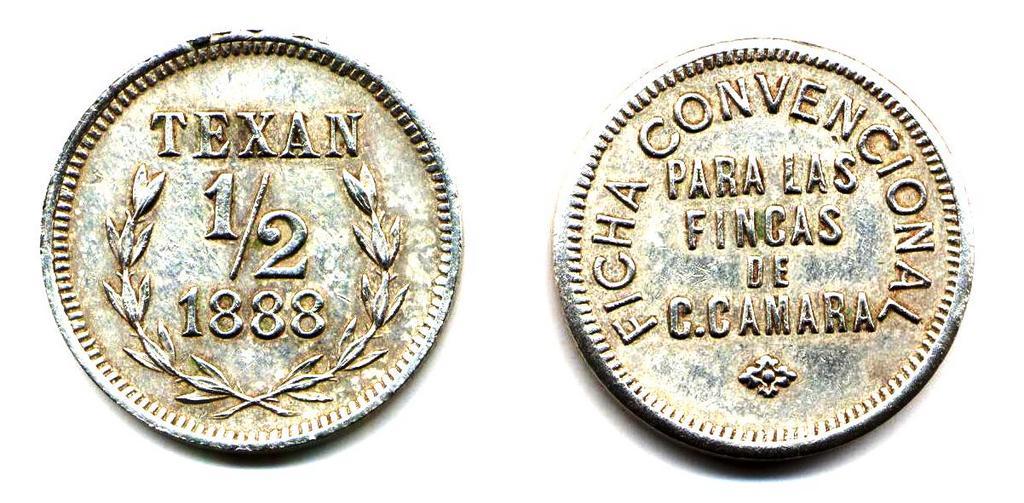 Keywords: Ficha por medio real de la Hacienda Texán Cámara, Yucatán de 1888 (01)(anverso y reverso).jpg es Ficha por medio real de la Hacienda Texán Cámara Yucatán de 1888 2012-08-29 own Inri PD-Mexico cc-zero Uploaded with UploadWizard Hacienda tokens from Yucatán Coins of Mexico |