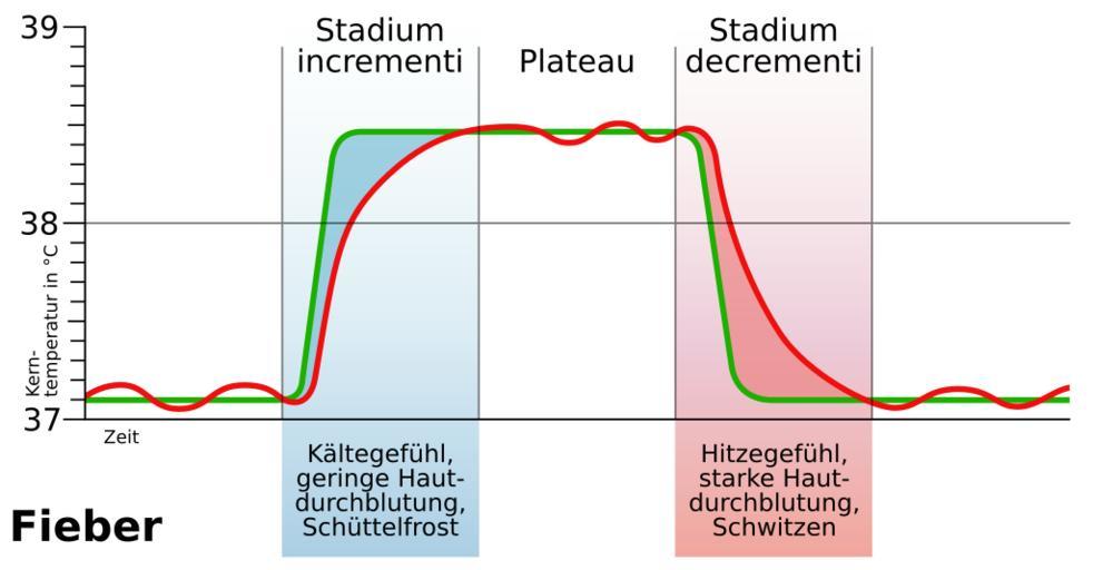 | Keywords: Fieber Kurve.svg de Typischer Verlauf von Fieber Die grüne Linie zeigt den Sollwert die rote die tatsächliche körpertemperatur en Course of fever Green line marks the set-point red the actual body temperature http //books google de/books id bl8xagi5ZFYC printsec frontcover dq silbernagel+pathophysiologie sig ACfU3U1STqflKq7ZNVSNEbOo_Xg5zqJsAA PPA21 M1 TaschenAtlas der Pathophysiologie Page 21 DooFi 2008-09-26 Fever | ||||