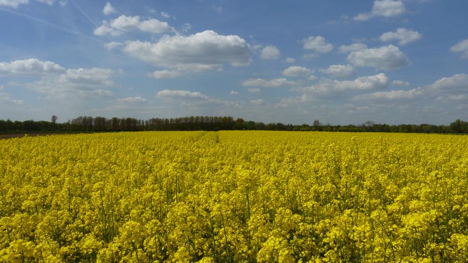 Keywords: field of rapeseeds spring rape blossom yellow sky agriculture clouds