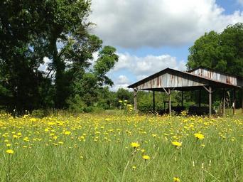 Keywords: field rural flowers yellow grass shed meadow environment idyllic outdoors agriculture uncultivated natural tranquil trees wildflower land pasture