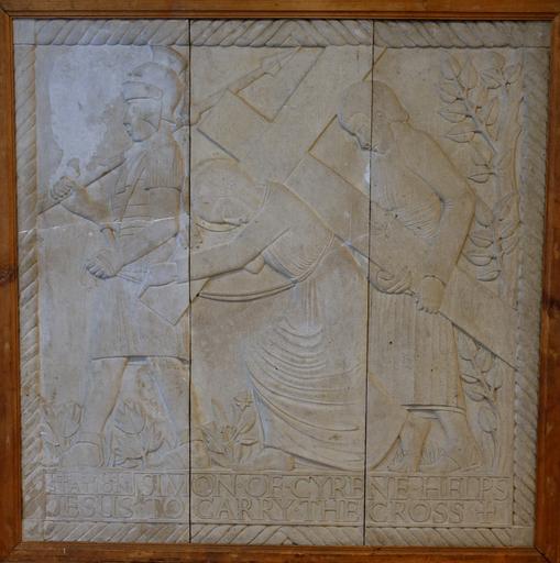 Keywords: Fifth Station of The Cross, trial panel for Westminster Cathedral, by Eric Gill, 1914, Hoptonwood stone relief in three vertical stones - Harry Ransom Center - University of Texas at Austin - DSC08567.jpg en Exhibit in the Harry Ransom Center - University of Texas at Austin Austin Texas USA This work is old enough so that it is in the public domain 2015-11-17 17 13 02 own Daderot other versions PD-old-70 cc-zero Sculptures in the Harry Ransom Center Eric Gill Stations of the Cross Westminster Cathedral |