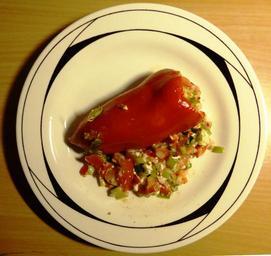Keywords: Filled-pepper.jpg en Pepper filled with tomatos cheese onion and garlic de Paprika gefüllt mit Tomaten Schafskäse Lauchzwiebel und Knoblauch own MartinThoma 2015-10-30 Pepper Dinners Taken with Panasonic Lumix DMC-TZ41 Images by Martin Thoma/Food Cc-zero |