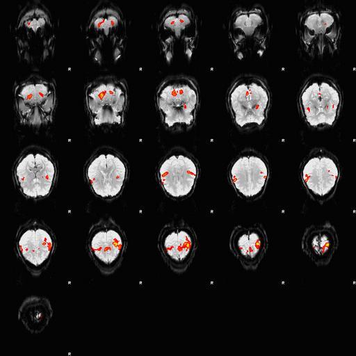| Keywords: Fingertapping experiment DXIII.jpg en An fMRI depiction of activated brain areas BOLD during an index finger-tapping sequence Experiment and imaging was performed in our dept at RIC at UTHSCSA Analysis for activation depiction was performed by me using fsl I used BET FAST and FEAT to obtain this image The experiment was performed in the following method Subjects performed a finger tapping sequence during a block design paradigm This study focused on only right hand unimanual index finger During the first 30 seconds the subjects moved their right index finger from side to side adduction-abduction at the rate of 2Hz followed by a 30 second rest period This sequence was repeated 6 times for a total of 6 minutes A Gradient-Echo planar sequence was used with the parameters of TR 2s TE 30ms and a flip angle of 90° and sixteen continuous 6mm-thick axial slices with an in-plane spatial resolution of 3mmX3mm I derived Own Zereshk This image was not published anywhere and was part of my class project Functional magnetic resonance imaging Sequence |