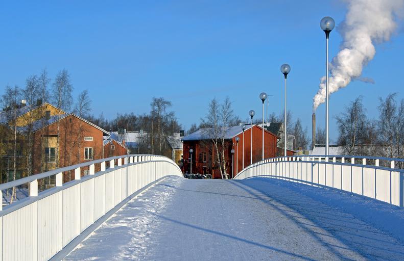 Keywords: finland bridge snow winter town village buildings beautiful trees clouds nature outside ice cold