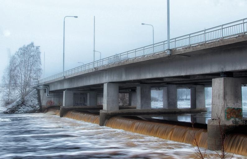 Keywords: finland bridge water river flow winter snow ice trees nature outside