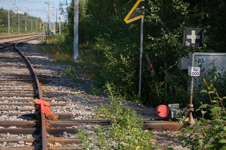 Keywords: Finnish derail in derailing position.jpg A Finnish derail device of standard type in derailing position with the derailing shoe turned and lockedon top of the rail The image also shows the hand-throw to operate the derail as well as the derail target plate with + sign Standardimallin suomalainen raiteensulku raiteen sulkevassa suistavassa asennossa Raiteensulun kenkä eli sulkukappale on käännetty kiskolle ja lukittu suistavaan asentoon Kuvassa näkyvissä myös käsiasetin sekä raiteensulun opastin +-merkki Own 2007-08-07 Teemu Vehkaoja Derails Rail tracks in Finland Taken with Nikon D50 Unidentified locations in Finland August 2006 in Finland |