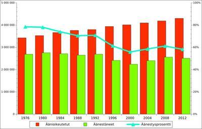 Keywords: Finnish municipal elections voting activity.svg fi Tilasto Manner-Suomen äänestysaktiivisuudesta ja äänioikeutetuista Suomen kunnallisvaaleissa 1976 “2012 Perustuu Tilastokeskuksen vaalitilastoon 1 1 Kunnallisvaalit 1976-2012 äänestystiedot 2014-05-03 19 36 36 own Nurtsio validSVG Created with Gnumeric cc-zero Uploaded with UploadWizard SVG statistics Municipal elections in Finland |