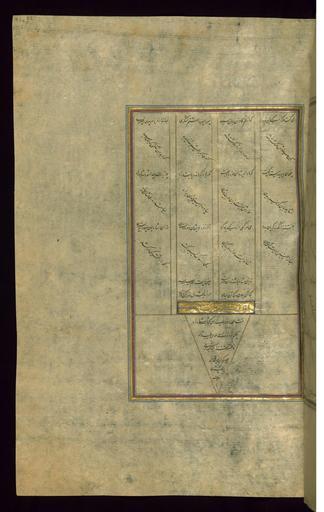 Keywords: Firdawsi - Colophon - Walters W602334A - Full Page.jpg This folio from Walters manuscript W 602 contains the 2nd of 2 colophons in Arabic This one is at the end of part 1 and gives the title of the work the scribe's name and the date of copying 1028 AH/AD 1618-1619 Qajar ink pigments laid paper cm 36 5 23 5 accession number W 602 334A 83515 Henry Walters Baltimore date and mode of acquisition unknown Walters Art Museum Henry Walters Acquired by Henry Walters Transliteration place of origin Herat Afghanistan Walters Art Museum license 2D Shahnameh Qajar Walters MS 602 Media contributed by the Walters Art Museum needs category review |