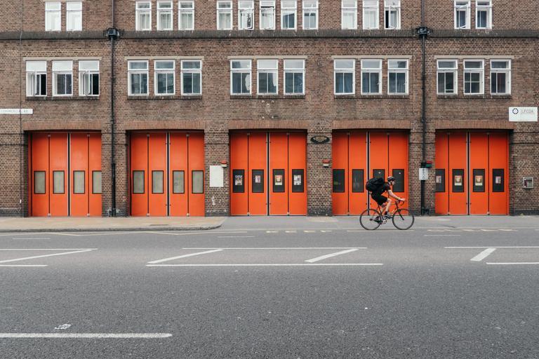 Keywords: fire brigade doors gates red orange department firefighter station emergency safety biker building