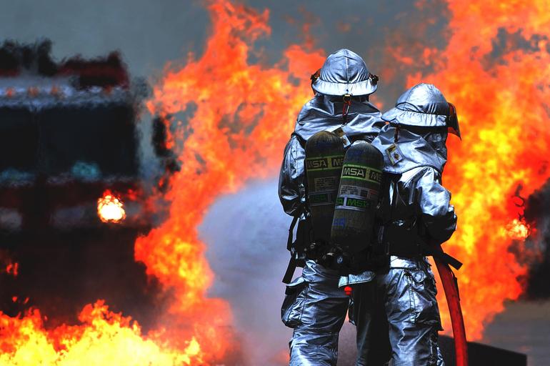 Keywords: firefighters training simulated plane fire flames hot heat dangerous equipment protection helmet gear