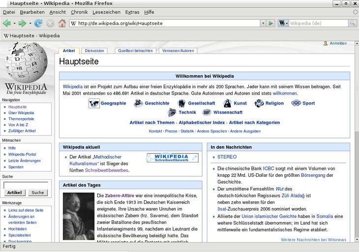 | Keywords: Firefox 2 de.png Mozilla Firefox 2 0 runnig under Debian GNU/linux 3 1 GNOME displaying the German Wikipedia Main Page/ Mozilla Firefox 2 0 unter Debian GNU/Linux GNOME mit der Hauptseite der deutschsprachigen Wikipedia Own October 28th 2006/ 28 Oktober 2006 n Chr MF-Warburg<small> de </small> free screenshot <br/>Software GPL LGPL MPL Wikipedia logo Cc-by-sa-3 0 Wikimedia trademark Text of Wikipedia and the P-xyz-lightblue png images in Willkommen bei Wikipedia GFDL relicense The image of emperor Wilhelm II PD-USGov Screenshots of Mozilla Firefox 2 x with German Debian screenshots German Wikipedia screenshots |