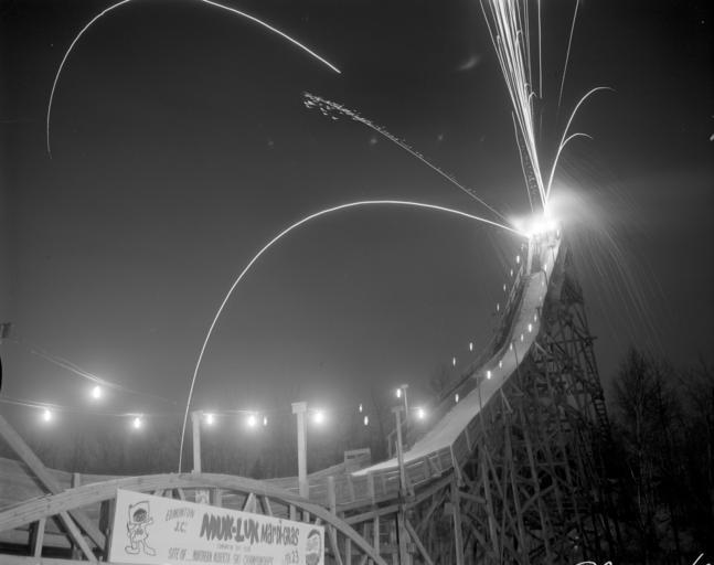 Keywords: alberta canada edmonton night lights ski jump skijump skiing skis skier fireworks winter festival ski club mardigras mukluk blackandwhite monochrome black and white Festivities as part of the Muk Luk Mardi Gras, Edmonton, Alberta, February 1963. Provincial Archives of Alberta, PA1329.6. Festivities as part of the Muk Luk Mardi Gras, Edmonton, Alberta, February 1963. Provincial Archives of Alberta, PA1329.6. |