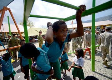 Keywords: First-ever Sapper 13 Exercise officially closes 131028-N-VN372-293.jpg en A local Timorese child is the first to conquer the monkey bars at his school's new playground following an official ribbon cutting ceremony and close of Sapper 13 Royal Australian Engineers from the Australian Defense Force's 1st Combat Engineering Regiment U S Navy Seabees from Naval Mobile Construction Battalion 3 and engineers from the U S Marine Corps 9th Engineering Support Battalion and Timor-Leste Defense Force teamed up to build a new school outside bathroom facility kitchenette and playground for the local Duyung suko or neighborhood in the Metinaro district of Dili Sapper 13 was the first exercise of its kind ever executed in Timor-Leste During the 28-day exercise the joint team shared construction techniques and increased interoperability between the three countries Seabees from NCMB 3 are also deployed to Timor-Leste to execute engineering civic assistance projects conduct formal training with the host nation and perform community relations events to help enhance shared capabilities and improve the country's social welfare One of the first battalions commissioned during World War II NMCB 3's legacy stands strong in its ability to build and fight anywhere in the world as either a full battalion or as a group of autonomous detachments simultaneously completing critical engineering and construction missions For this deployment NMCB 3 has split into nine details to perform critical construction projects in remote island areas such as Timor-Leste Tonga Cambodia and the Philippines The teams will also conduct operations in Atsugi Yokosuka and Okinawa Japan Chinhae Republic of Korea and China Lake Calif The Naval Construction Force is a vital component of the U S Maritime Strategy They provide deployable battalions capable of providing disaster preparation and recovery support humanitarian assistance and combat operations support NMCB 3 provides combatant commanders and Navy component commanders with combat-ready warfighters capable of general engineering construction and limited combat engineering across the full range of military operations 2013-10-28 Petty Officer 1st Class Chris Fahey https //www dvidshub net/image/1041450 131028-N-VN372-293 2013-10-28 02 30 METRINARO TL PD-USGov-Military-Navy United States Navy Seabees Naval Mobile Construction Battalion 3 Sapper 2013 Images from DoD uploaded by Fæ |
