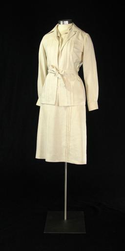 MAKE A MEME View Large Image First Lady Betty Ford's beige suit.jpg Artwork en A slim-tucked dress designed by Albert Capraro for First Lady Betty Ford The beige slim-tucked dress includes a matching silk jacket features long sleeves with button down cuffs a button ...