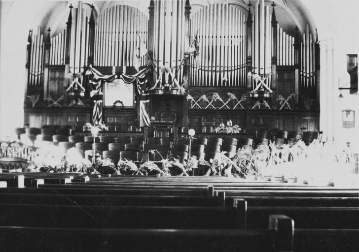 | Keywords: harvest harvesting farms farming agriculture thanksgiving alberta blackandwhite monochrome black and white Interior view of the First Presbyterian Church, Edmonton, 105 St. and Jasper Avenue, showing the pulpit, organ, choir seats, and Thanksgiving Day decorations, 1925. A16842 Interior view of the First Presbyterian Church, Edmonton, 105 St. and Jasper Avenue, showing the pulpit, organ, choir seats, and Thanksgiving Day decorations, 1925. A16842 | ||||