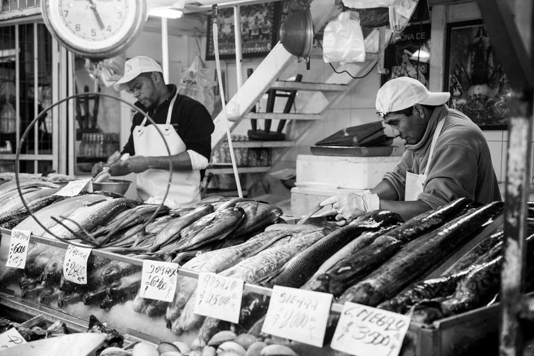 Keywords: fish market market traditionally spain fish frisch sea animals market stall sell crabs black white chile fischer angler