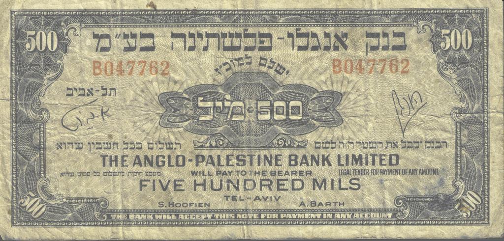 Keywords: Five hundred mils.jpg A banknote of 500 mils half a Palestine pound issued by the Anglo-Palestine bank a company affiliated to the World Zionist Organization to serve as a temporary legal tender for the State of Israel before a national currency was introduced August 1948 - June 1952 These notes were used only in Israel and not in the West Bank the Gaza Strip or Jordan w he Hebrew Wikipedia user ×©× ×™× ×™ Palestine pound Anglo-Palestine Bank |