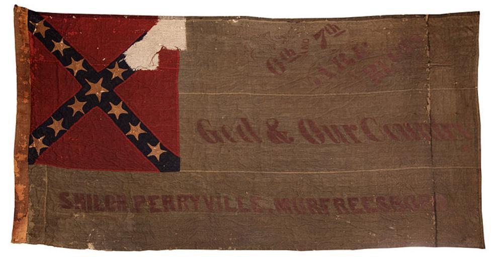 Keywords: Flag, 6th & 7th Arkansas Infantry, 2nd National Pattern.jpg en wikipedia 2012 January 5 A Confederate 2nd national flag of the combined 6th 7th Arkansas Infantry Mentioned in The Battle Flags of the Confederate Army of Tennessee p 98 currently in the Missouri State archives in Columbia Missouri 40 1/2 x 76 1/2 white bunting field with a red canton bearing an unedged 3 1/2 wide St Andrew's cross bearing thirteen white cotton stars those on the arms 3 1/2 across their points the center 5 across its points applied to the reverse and cut away on the obverse reverse side accordingly 1/2 larger in diameter The white field bears the following inscriptions upper- in outline scrolls 6th and 7th/ARK/REG'T middle God Our Country ; lower SHILOH PERRYVILLE MURFREESBORO all in red painted lettering This flag dates no earlier than May of 1863 and was probably a parade flag used briefly between May and June of 1863 however no firm history survives regarding it 2011 11 22 http //web archive org/web/20091029033543/http //geocities com/capitalguards/flags html Transferred from http //en wikipedia org en wikipedia by SreeBot Unknown<br /> Uploaded by Damon cluck at en wikipedia other versions PD-US PD-art Original upload log page en wikipedia Flag _6th_ _7th_Arkansas_Infantry _2nd_National_Pattern jpg Upload date User Bytes Dimensions Comment 2011-11-22 14 23 UTC Damon cluck 73121 bytes 800×417 <small><nowiki> A Confederate 2nd national flag of the combined 6th 7th Arkansas Infantry Mentioned in The Battle Flags of the Confederate Army of Tennessee p 98 currently in the Missouri State archives in Columbia Missouri 40 1</nowiki></small> Arkansas in the American Civil War Military units and formations of the United States Military in Arkansas Government of the United States Missouri State Archives |