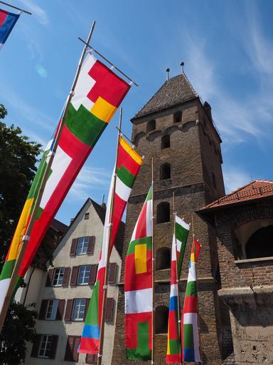 Keywords: flags colorful blow wind flutter danube fixed ulm metzgerturm