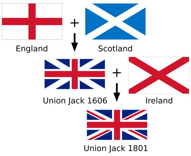 Keywords: Flags of the Union Jack named en.svg Development of the Union Jack the cross of St George flag of England was combined with the saltire of St Andrew flag of Scotland to form the flag of Great Britain The flag of Great Britain was then combined with the red saltire of the insignia of the 1783 royal Order of St Patrick not the flag of Ireland to form the flag of the United Kingdom Entwicklung des Union Jack Die Flagge Englands rotes Georgskreuz auf weißem Grund und die schottische Flagge weißes Andreaskreuz auf blauem Grund wurden kombiniert zur Flagge Großbritanniens Diese wurde kombiniert mit dem den 1783 gegründeten Order of St Patrick repräsentierenden Patrickskreuz zur Flagge des Vereinigten Königreichs self-made based on Image Flags of the Union Jack svg 2016-06-27 Guilherme Paula derivative work Master Uegly Development of the Union Jack |