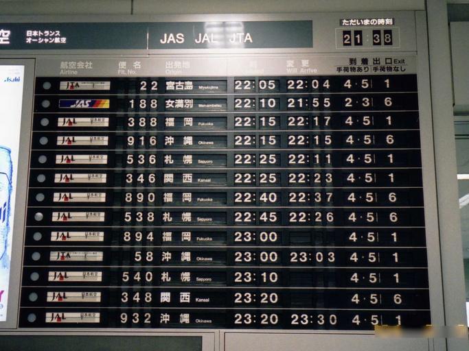 Keywords: Flap board Tokyo Intl Airport Arrival.jpg Tokyo International Airport Arrival lobby Photo by Cassiopeia_sweet 2003-10-09 Cassiopeia_sweet Haneda Airport Terminal 1 Split-flap flight information display systems Split-flap displays in public transport in Japan Flight information display systems in Japan Public digital clocks in Japan |