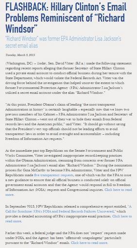 | Keywords: FLASHBACK - Hillary Clinton's Email Problems Reminiscent of 'Richard Windsor'.jpg FLASHBACK Hillary Clinton s Email Problems Reminiscent of Richard Windsor Richard Windsor was former EPA Administrator Lisa Jackson s secret email alias Tuesday March 3 2015 Washington DC Today Sen David Vitter R-La made the following statement regarding recent reports alleging that former Secretary of State Hillary Clinton used a private email account to conduct official business during her tenure with the State Department which would violate the Federal Records Act Vitter was the driving force behind the investigation that helped uncover the extent to which former Environmental Protection Agency EPA Administrator Lisa Jackson s utilized a secret email account under the alias Richard Windsor At this point President Obama s claim of leading the most transparent Administration in history is certainly laughable especially now that we know two previous members of his Cabinet EPA Administrator Lisa Jackson and Secretary of State Hillary Clinton went out of their way to hide their emails from federal records laws and the American public said Vitter It should go without saying that the President s very top officials should not be leading efforts to avoid transparency laws in order to avoid oversight and accountability including Freedom of Information Act requests As the immediate past top Republican on the Senate Environment and Public Works Committee Vitter investigated inappropriate record-keeping practices within the Obama Administration stemming from concerns over former EPA Administrator Lisa Jackson s email alias Richard Windsor During the nomination process for Gina McCarthy to become EPA Administrator Vitter and the EPW Republicans made five transparency requests one of which was for the EPA to issue a new guidance to ensure that all official business is conducted solely on official government email accounts and that the Agency would respond in full to Freedom of Information Act FOIA requests and Congressional inquiries Click here to read more In September 2013 EPW Republicans released a comprehensive report entitled A Call for Sunshine EPA's FOIA and Federal Records Failures Uncovered which provides a detailed accounting of EPA's inappropriate email practices Click here to read more Earlier this week a federal judge said the EPA does not respect requests made under FOIA and the Agency has been offensively unapologetic particularly pursuant to the Richard Windsor emails Click here to read more http //www vitter senate gov/newsroom/press/flashback-hillary-clintons-email-problems-reminiscent-of-richard-windsor 2015-03-03 United States Senator David Vitter s Flashback - Hillary Clinton's Email Problems Reminiscent of 'Richard Windsor' at Wikisource Hillary Rodham Clinton in 2015 Hillary Rodham Clinton email use as United States Secretary of State Hillary Rodham Clinton-related documents David Vitter PD-USGov |