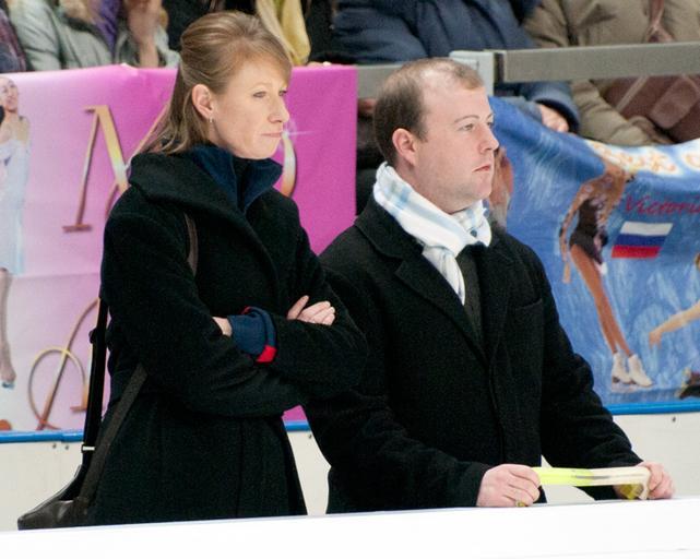 Keywords: Flatt-coaches.jpg en Rachael Flatt's coaches Justin Dillon and Lynn Smith at the 2011 Cup of Russia short program own 2011-11-25 deerstop cc-zero 2011 Rostelecom Cup Figure skating coaches Justin Dillon