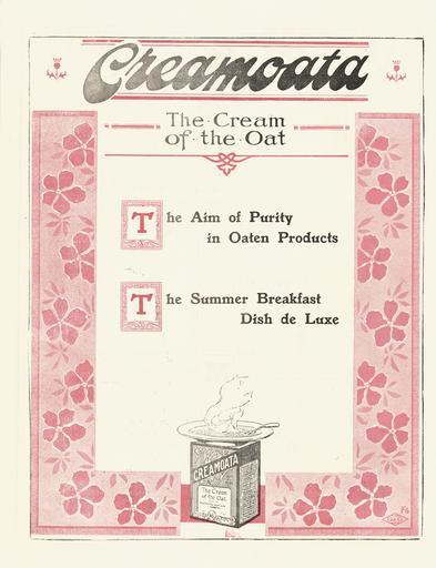 | Keywords: text Creamoata "the cream of the oat" represents "the aim of purity in oaten products", and "the summer breakfast dish de luxe". Shows a packet of creamoata with a steaming bowl of oat porridge on top of it. The whole is in a wide floral border. Quantity: 1 colour photo-mechanical print(s) on pamphlet. Physical Description: Offset print on folded pamphlet, 297 x 230 mm. Provenance: Purchased from Barney Brewster, Nelson, in 2004. Fleming & Company Ltd (Gore) :Creamoata, the cream of the oat. [ca 1910]. [Pamphlet advertising Methven boilers and pipes, Creamoata, Thomson's Purity Raspberry Vinegar, and Thomson's Purity Lime Juice. ca 1910].. Ref: Eph-B-RETAIL-1910-01-02. Alexander Turnbull Library, Wellington, New Zealand. natlib.govt.nz/records/23132657 Creamoata "the cream of the oat" represents "the aim of purity in oaten products", and "the summer breakfast dish de luxe". Shows a packet of creamoata with a steaming bowl of oat porridge on top of it. The whole is in a wide floral border. Quantity: 1 colour photo-mechanical print(s) on pamphlet. Physical Description: Offset print on folded pamphlet, 297 x 230 mm. Provenance: Purchased from Barney Brewster, Nelson, in 2004. Fleming & Company Ltd (Gore) :Creamoata, the cream of the oat. [ca 1910]. [Pamphlet advertising Methven boilers and pipes, Creamoata, Thomson's Purity Raspberry Vinegar, and Thomson's Purity Lime Juice. ca 1910].. Ref: Eph-B-RETAIL-1910-01-02. Alexander Turnbull Library, Wellington, New Zealand. natlib.govt.nz/records/23132657 |