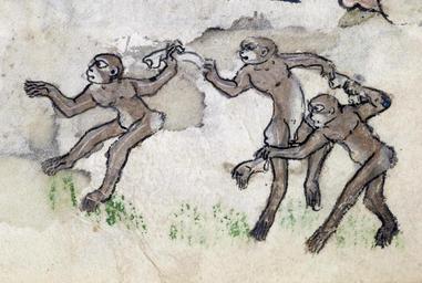 Keywords: Flemish - Apes Dancing to Ring-around-a-Rosy - Walters W82193R - Detail A.jpg The song Ring-around-a-Rosy is still popular today often danced in a circle just as we see the monkeys doing here Yet this seemingly lighthearted song has a dark past The plague swept Europe during the 14th century and the song's words actually refer to its terrible symptoms a circular rose-colored rash sneezing or coughing and finally death Flower petals were worn in a pouch around the neck to keep the smell of death away The song then seems very different in this context Ring-a ring-o-rosies A pocket full of posies Achoo Achoo We all fall down ca 1315 25 Gothic parchment with ink and paint cm 16 11 accession number W 82 193R 81316 Henry Walters Baltimore after 1894 by purchase Walters Art Museum Henry Walters Acquired by Henry Walters after 1894 Illuminated Manuscripts Masterpieces in Miniature The Walters Art Gallery Baltimore 1984-1985 Checkmate Medieval People at Play The Walters Art Museum Baltimore 2010 place of origin Ghent Belgium Walters Art Museum license 2D Media contributed by the Walters Art Museum needs category review Dancing animals in art Ring a Ring o' Roses in art Medieval miniatures of monkeys Walters MS W82 - Psalter-Hours Monkeys acting as humans in art |