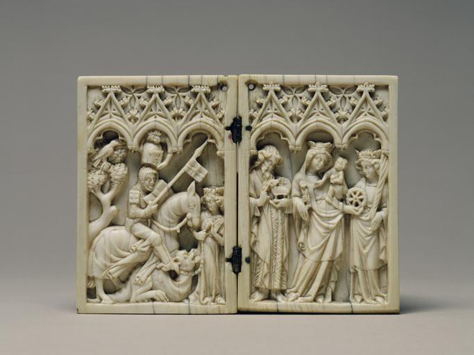 Keywords: Flemish - Diptych with Saint George and the Dragon, and the Virgin and Child with Saints - Walters 711181 - Open.jpg On the left panel of this superb devotional ivory St George in medieval armor raises his lance and shield in triumph An angel lifts his helmet from his head as the rescued princess leads away the defeated dragon The right panel shows the Virgin and Child between Saints John the Baptist and Catherine of Alexandria The choice of St Catherine suggests that this diptych was made for the private use of an aristocratic woman between 1340 1360 Medieval ivory cm 9 1 12 1 0 7 accession number 71 1181 34597 R Forrer Strassbourg E and M Kofler-Truniger Lucerne Thomas Flannery Winnetka Illinois Thomas Flannery Sale Sotheby's London December 1 1983 lot 63 Edward Lubin New York Max Falk New York Walters Art Museum Gift of Mr Max Falk in honor of former Director and Medieval Art Curator Richard H Randall 1991 place of origin west Belgium Walters Art Museum license Medieval ivory in the Walters Art Museum Flemish religious art in the Walters Art Museum Reliefs of Saint George and the Dragon Madonna and Child Ivorycarving from Flanders |