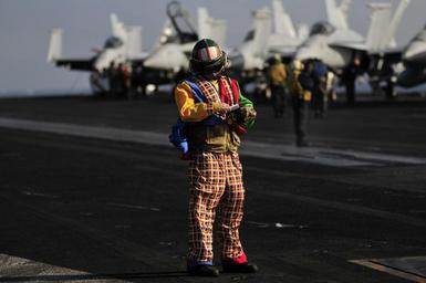| Keywords: Flickr - Official U.S. Navy Imagery - A Sailor wears a clown suit while launching aircraft..jpg PACIFIC OCEAN May 22 2012 Aircraft Launch and Recovery Equipment Officer Lt Douglas Kay wears a clown suit while launching aircraft as pilots and aircraft assigned to Carrier Air Wing CVW 17 depart the flight deck of the Nimitz-class aircraft carrier USS Carl Vinson CVN 70 and return to their home bases after nearly six months embarked Carl Vinson and CVW 17 recently completed a deployment to the U S 5th and 7th Fleet areas of operations U S Navy photo by Mass Communication Specialist Seaman George M Bell/Released 120522-N-ZI635-087 Join the conversation http //www facebook com/USNavy www facebook com/USNavy http //www twitter com/USNavy www twitter com/USNavy http //navylive dodlive mil navylive dodlive mil http //www flickr com/photos/usnavy/7261359816/ A Sailor wears a clown suit while launching aircraft 2012-05-22 19 41 http //www flickr com/people/56594044 N06 Official Navy Page from United States of America MCSN George M Bell/U S Navy U S Navy photo PD-USGov-Military-Navy Official U S Navy Imagery http //flickr com/photos/56594044 N06/7261359816 2012-11-13 13 59 39 cc-by-2 0 Images from United States Navy to check United States Navy images |