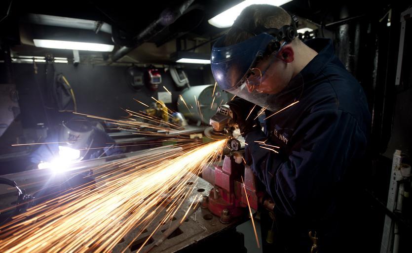MAKE A MEME View Large Image Navy Imagery - A Sailor welds a bracket in the sheet metal shop..jpg ARABIAN SEA Jan 07 2012 Hull Maintenance Technician Fireman Apprentice Mitchell Myrstol left welds a bracket while Hull Maintenance Technician Fireman Tom Fields grinds a ...