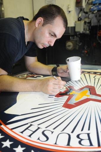 | Keywords: Flickr - Official U.S. Navy Imagery - Sailor paints the ship's seal on an aircraft tow tractor in the hangar bay aboard USS George H.W. Bush.jpg ARABIAN GULF June 29 2011 Aviation Support Equipment Technician 2nd Class Michael Giunta paints the ship's seal on an aircraft tow tractor in the hangar bay aboard the aircraft carrier USS George H W Bush CVN 77 George H W Bush is deployed supporting maritime security operations and theater security cooperation efforts in the U S 5th Fleet area of responsibility on its first operational deployment U S Navy photo by Mass Communication Specialist Seaman Gregory M Wilhelmi/Released 110703-N-WH671-059 http //www flickr com/photos/usnavy/5913190382/ Sailor paints the ship's seal on an aircraft tow tractor in the hangar bay aboard USS George H W Bush 2011-07-03 15 13 http //www flickr com/people/56594044 N06 Official Navy Page from United States of America MCSN Gregory M Wilhelmi/U S Navy Attribution License IPTC Source Navy Visual News Service PD-USGov-Military-Navy Official U S Navy Imagery http //flickr com/photos/56594044 N06/5913190382 2012-11-14 16 58 13 cc-by-2 0 Images from United States Navy to check |