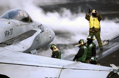 Keywords: Flight deck Sailors position F-18 Hornet preparation launch